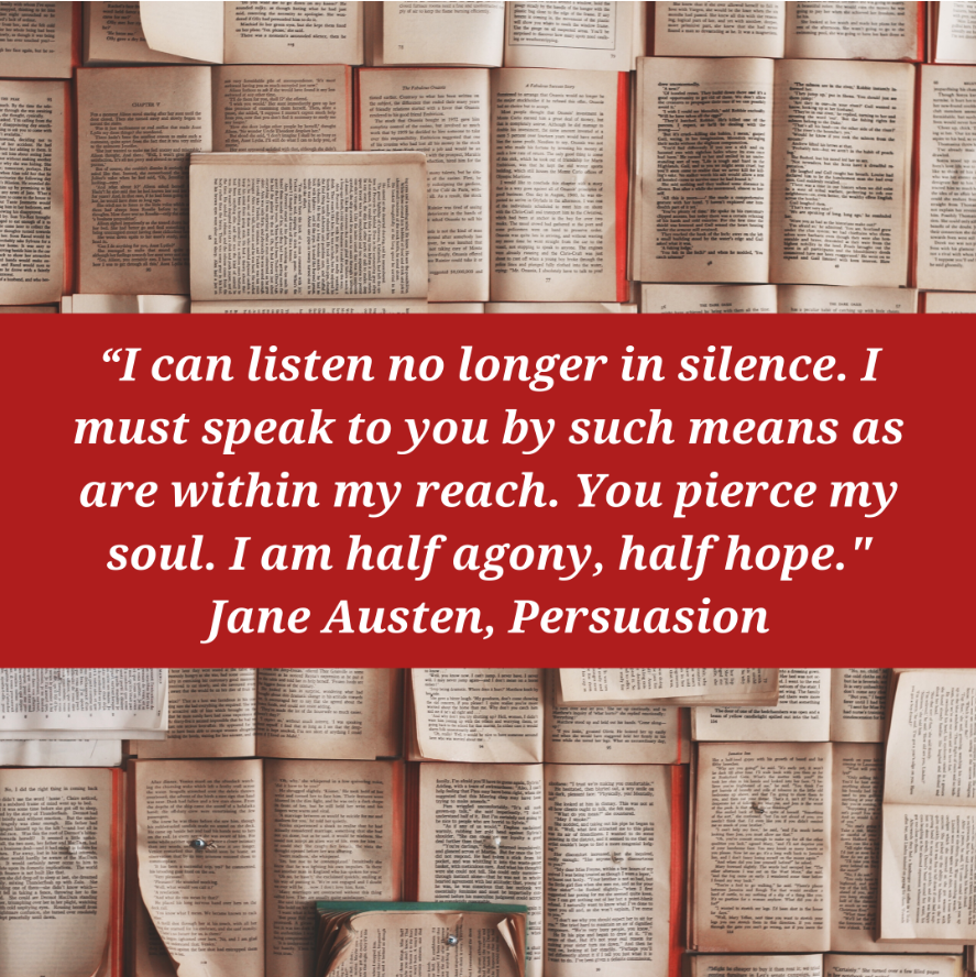 - Jane Austen, Persuasion. I was inspired to read this because Professor Benson posted an interesting article about Jane Austen. I persuaded my book club to read it as it is said to be her most “moving and mature” works.