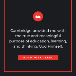 Hello, my name is Joey Jekel. I graduated from Cambridge in 2014, at which point I headed to Fayetteville to attend the University of Arkansas. I came to study English Creative Writing, Philosophy, and Classical Studies there, graduating in May of 2018. Now, I work for Reformed University Fellowship (RUF) at the University of Alabama.
