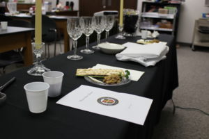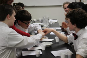 Mr. Pikman also connected the elements to our Christian faith. He explained the significance of each of the four cups for the Jews (Sanctification, Judgement, Redemption, and Praise) and how each is fulfilled through Christ. Perhaps the most interesting part of the Passover for the students was the Afikomen. In Hebrew tradition, the leader of the Passover places 3 pieces of matzah in the “matzah bag” (one bag with 3 sections/divisions). Later the middle piece is removed, broken, wrapped, and hidden in the room for the children to seek after the eating of the meal. When a child finds the Afikomen, it is brought back out, broken, and shared among all participants. The Trinitarian imagery behind the Afikomen is hard to miss – it is the middle piece that is broken, buried, and “resurrected”, just as the middle person of the Trinity, the Son, was broken and buried for our sins, but was resurrected in the ultimate victory over death. It is this middle piece of matzah that Jesus broke, telling his disciples to take and eat, for “This is my body, which is given for you” (Luke 23:19).